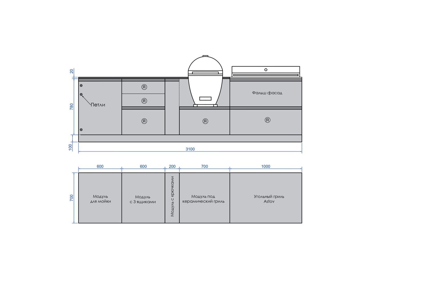 1. Модуль под мойку 600 мм (левый) 2. Модуль для хранения с 3мя ящиками 600 мм 3. Модуль с крючками 200 мм (левый) 4. Модуль под керамический гриль 700 мм 5.Угольный гриль (мангал) Astov 1000 мм