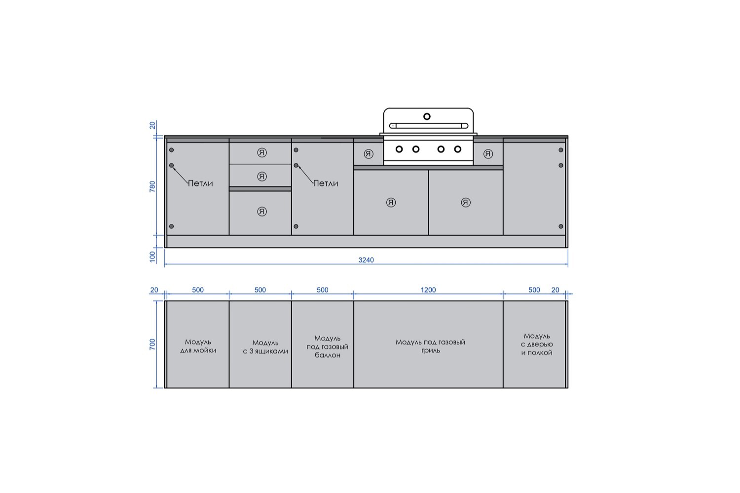 1. Фальш-панель боковая с регулируемыми ножками 20 мм 2. Модуль под мойку 500 мм (левый) 3. Модуль для хранения с 3мя ящиками 500 мм 4. Модуль для газового баллона 500 мм (левый) 5. Модуль для газового гриля 1200 мм 6. Модуль для хранения с дверью и полкой 500 мм (правый) 7. Фальш-панель боковая с регулируемыми ножками 20 мм