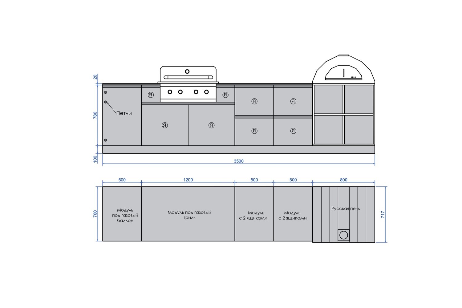 1. Модуль под газовый баллон 500 мм (левый) 2. Модуль под газовый гриль с 4мя выдвижными ящиками 1200 мм 3. Модуль для хранения с 2мя ящиками 500 м 4. Модуль для хранения с 2мя ящиками 500 мм 5. Русская печь с дровником 800х700 мм