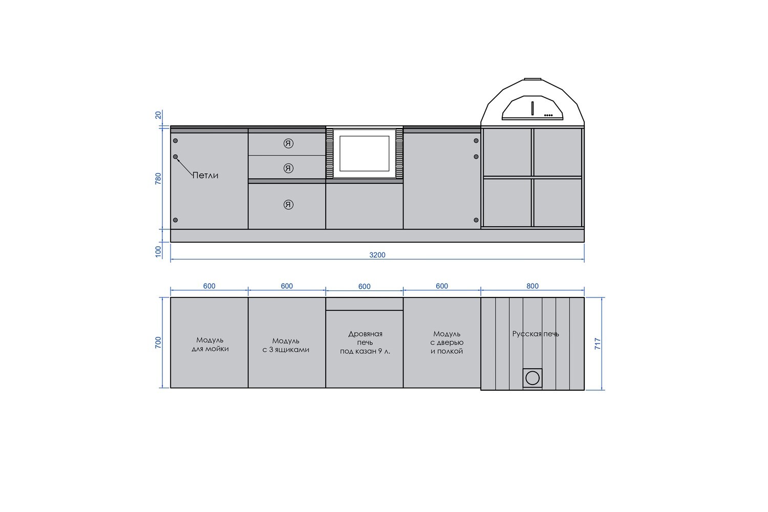 1. Модуль под мойку 600 мм (левая) 2. Модуль для хранения с 3мя ящиками 600 мм 3. Дровяная печь под казан 9 л 600 мм с доборной пластиной 4. Модуль для хранения с дверью и полкой 600 мм (правый) 5. Русская печь с дровником 800х700 мм