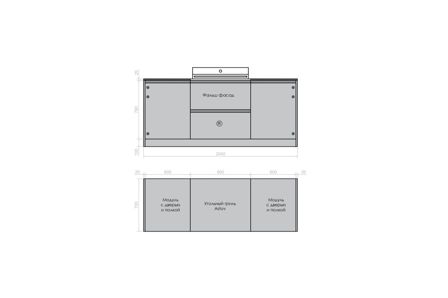 1. Фальш-панель боковая с регулируемыми ножками 20 мм 2. Модуль для хранения с дверью и полкой 600 мм (левый) 3. Угольный гриль Astov BBQ с выдвижным ящиком 800 мм 4. Модуль для хранения с дверью и полкой 600 мм (правый) 5. Фальш-панель боковая с регулируемыми ножками 20 мм